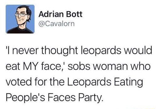 'i never thought leopards would eat my face,' sobs woman who voted for the leopards eating people's faces party. 'i never thought leopards would eat my face,' sobs woman who voted for the leopards eating people's faces party. Revel in the schadenfreude anytime someone has a sad because they're suffering consequences from something they voted for or supported or wanted to impose on other people. 'i never thought leopards would eat my face,' sobs woman who voted for the leopards eating people's faces party. 'i never thought leopards would eat my face,' sobs woman who voted for the leopards eating people's faces party. 'i never thought leopards would eat my face,' sobs woman who voted for the leopards eating people's faces party. Jul 31, 2020 · about community. Jan 30, 2019 · on october 16th, 2015, twitter user @cavalorn tweeted, 'i never thought leopards would eat my face,' sobs woman who voted for the leopards eating people's faces party. the tweet gained over 58,000 retweets and 92,000 likes over the following five years (shown below). Sep 25, 2020 · leopards ate my face when i voted for the leopards eating people's faces party is a parody subreddit which almost exclusively features content of people regretting their choice of voting for brexit or trump. Revel in the schadenfreude anytime someone has a sad because they're suffering consequences from something they voted for or supported or wanted to impose on other people. 'i never thought leopards would eat my face,' sobs woman who voted for the leopards eating people's faces party. Mar 25, 2017 · about community. Revel in the schadenfreude anytime someone has a sad because they're suffering consequences from something they voted for or supported or wanted to impose on other people.
